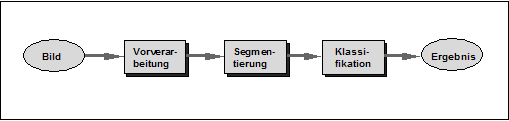 Alle Mustererkennungsanwendungen weisen das gleiche Funktionsprinzip auf. Die Meßdaten werden in Form von Bildern in das System eingegeben. Anschließend werden aus den Daten charakteristische Merkmale gewonnen. Dies erfolgt durch Segmentierung der Objekte. Bei diesem Prozeß werden die anliegenden Daten stark reduziert. Durch die Segmentierung werden Merkmale im Merkmalsraum gewonnen, der im allgemeinen eine wesentlich geringere Dimension aufweist als der Datenraum. Im Zuge dieser Entscheidung muß also das beträchtliche Informationsvolumen am Eingang auf wenige Bit reduziert werden, z. B. von etwa 5·106 Bit bei einem Dia auf etwa 5 Bit bei einem Großbuchstaben.2 Dies ist für eine effiziente Mustererkennung von großer Bedeutung. Falls nun feste Merkmalsklassen, sogenannte Cluster, vorgegeben sind, können die Objekte klassifiziert werden, das heißt in bestimmte Merkmalsklassen eingeordnet werden.1 Als Ergebnis wird eine Entscheidung getroffen.
