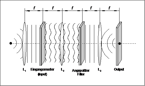Als Input dient hier ein Eingangsmuster, von dem die Linse L2 die Fourier-Transformierte bildet. Die Filtermaske befindet sich in der Fokusebene der Linse L2. Wenn sie dem Eingangsmuster angepaßt ist, beseitigt sie alle Unebenheiten der auftreffenden Wellenfront. Die transmittierte Welle ist demnach vollkommen eben. Diese ebene Welle wird von der Linse L3 zu einem hellen Punkt fokussiert. Wenn ein Eingangsmuster, das nicht der Filtermaske angepaßt ist, am Eingang anliegt, so werden die Unebenheiten nicht herausgefiltert. Die Wellenfront nach der Filtermaske ist uneben und wird von der Linse L3 nicht zu enem hellen Punkt fokussiert. Die Anwesenheit des zur Filtermaske passenden Eingangssignals kann einfach durch Messung der Intensität im Brennpunkt der Linse L3 bestimmt werden.
