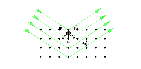 Die Interferenzerscheinung der Bragg-Reflexion unterscheidet sich von der Interferenz am Strichgitter dadurch, daß ein Raumgitter nur eine bestimmte Wellenlänge beugt, wenn die Strahlung unter einem definierten Winkel auf das Raumgitter trifft (Abb. 9). Man denke sich eine Anordnung von Ebenen im Abstand x. Nach Bragg interpretiert man das Ergebnis der Streustrahlen-interferenz als regelmäßige Reflexion der einfallenden Strahlung an den Ebenen.