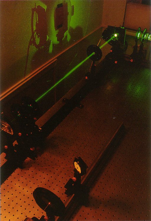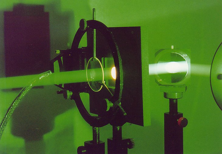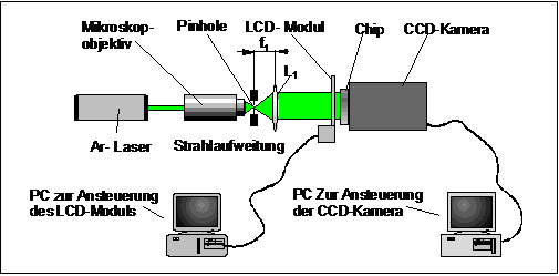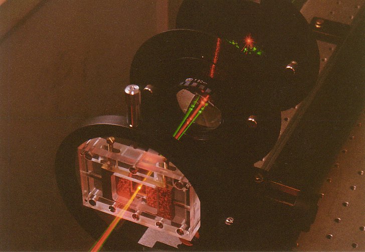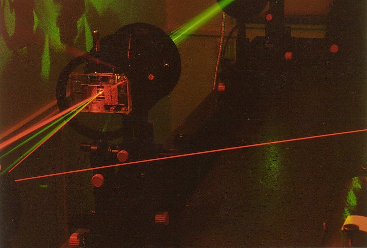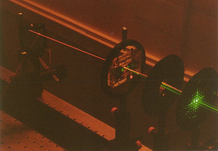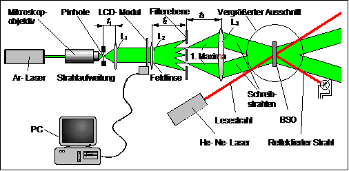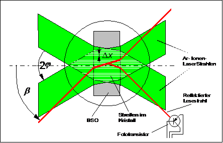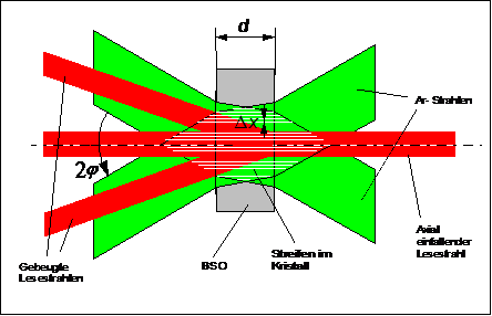 Kreuzen sich zwei Ar-Ionen-Laserstrahlen von 514 nm Wellenlänge, so bilden sich im Überschneidungsraum Interferenzstreifen. Die Lichtintensität ist durch die Interferenz sinusförmig moduliert. Bringt man einen BSO-Kristall in den Überschneidungsraum, so wird der Brechungsindex des Kristalls periodisch moduliert. Dieses Raumgitter kann mit einem He-Ne-Laserstrahl mit = 633 nm detektiert werden, wobei die Einhaltung des Bragg-Winkels wichtig ist. Trifft der Lesestrahl unter diesem Winkel auf das Raumgitter, so kommt es zur Bragg-Reflexion. Der Brechungsindex wird wegen der geringen Empfind-lichkeit des Kristalls im roten Bereich kaum beeinflußt.