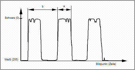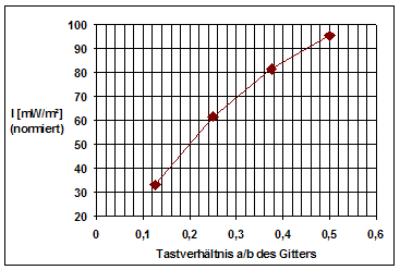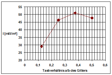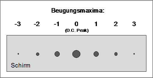 Betrachtet man die Ortsfunktion eines Transmissionsgitters, so stellt man fest, daß f(x) nur positive Werte annimmt. A0 nimmt daher einen Wert von ungleich null an. Ist bei einem Transmissionsgitter der Linienzwischenraum nicht gleich der Linienbreite, so ist das Tastverhältnis a/b bzw. / ungleich 0,5. 2 bzw. a ist hier die Liniendicke und 2 bzw. b die Gitterperiode (Abb. 4).